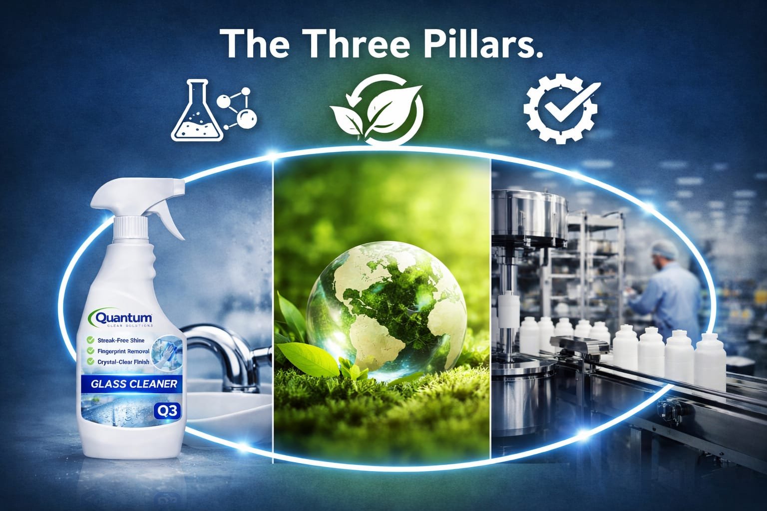 At Quantum Clean Solutions, efficacy comes first because cleanliness should never be a compromise. Our formulations are engineered to deliver superior performance by working faster, lasting longer, and meeting the highest standards of effectiveness. At the same time, we believe strong results must go hand in hand with responsible science, which is why our approach to sustainable chemistry focuses on reducing environmental impact without sacrificing cleaning power. This commitment is supported by reliable manufacturing practices, strict quality control, and modern production systems that help us ensure every batch meets industry standards and delivers dependable, high-quality products at scale.